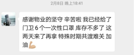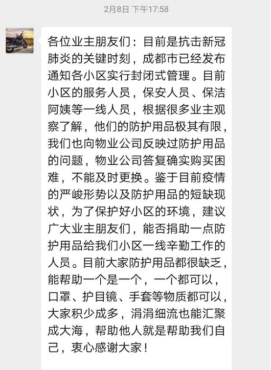 由于疫情防控一线的物业工作人员缺少口罩、消毒液等防疫物资,得知这一情况后,2月8日,金沙·鹭岛小区业委会成员在业主微信群里发出倡议,呼吁广大业主为一线物业人员捐助防护用品。